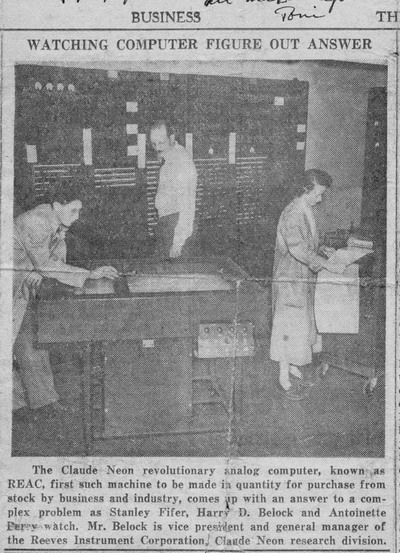 The REAC was first used in 1946 for “Project Cyclone”, research on rocket guidance systems, forerunners of today’s cruse missiles. The computers were also used for fire control systems. (As I recall, there were anti-aircraft turrets in the building as well as the rear gun mount section of a B-25 and an actual submarine in the basement, ostensibly for inertial guidance system work that led to the Nautilus being able to run under water for a long duration, using gyros for tracking instead of sextants. – Michael Wolfe) The first articles after declassification in 1950, were in the The New York Times of April 16, 1950 section F, page 11: ![]() The woman on the right is Antoinette Weston Wolfe, code named “Perry”.