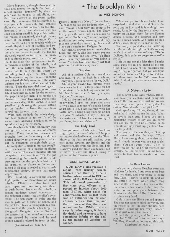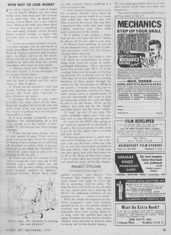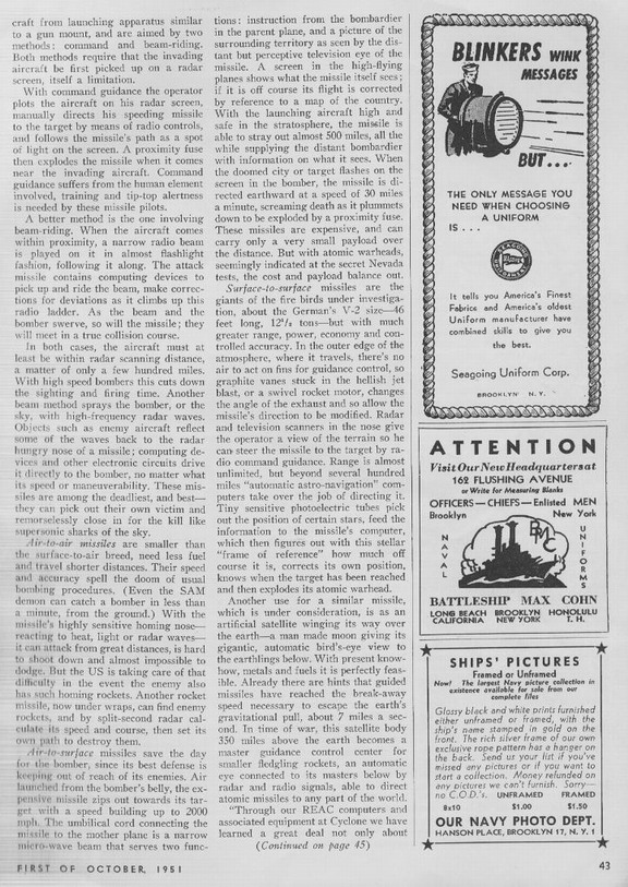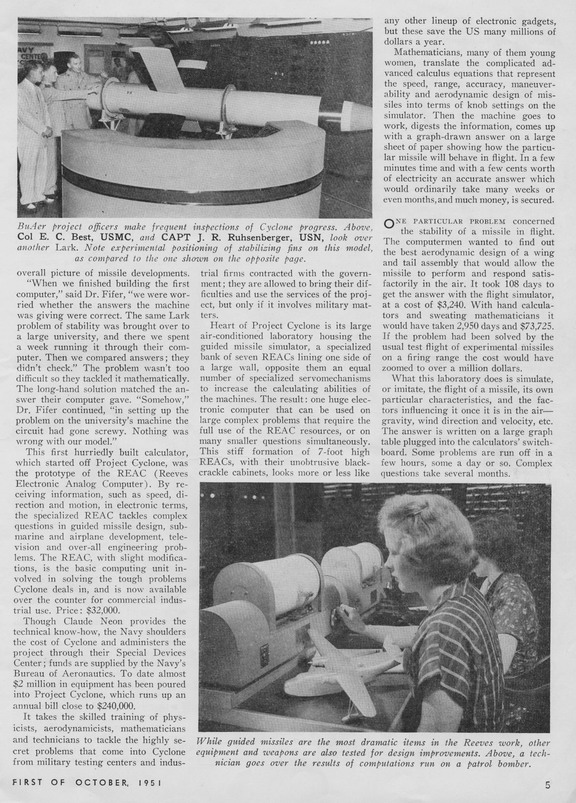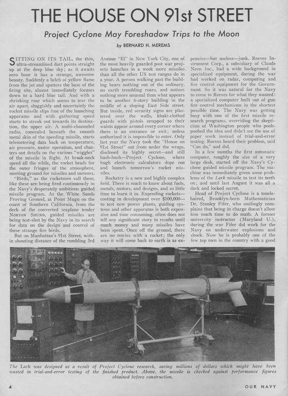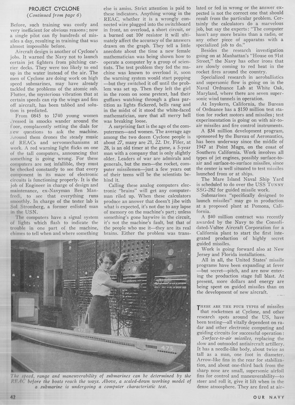 Real rocket tests, such as last week's at Cocoa are expensive items in any nation's budget. The missile itself, including development cost, may represent many hundred thousand dollars. To follow its flight requires a network of observation posts with radar, telescopes, radio locators and other intricate instruments specially designed for the purpose. Much cheaper are the "test flights" performed for the Navy by the Reeves Instrument Corp., subsidiary of Claude Neon Inc. Reeves's rockets do not fly out of the heavily guarded laboratory on Manhattan's 91st Street. They are only electronic signals in an analogue computer's brain, but they have taught the Navy more about guided missiles than many real flights would. Designing guided missiles is vastly more difficult than designing "inhabited" aircraft. A new model airplane has a pilot on board to correct its maiden errors, and (if all goes well) to bring it down intact for study and improvement. Guided missiles depend on artificial brains which need to be tested themselves, and they are seldom recovered except as a mass of wreckage. To test a new missile by the cut-and-try method of actual flight is expensive not only in money, but also in more precious time. In 1946, the Office of Naval Research asked Reeves Instrument to set up a combination of its analogue computers* which would be versatile enough to simulate the flight of any guided missile. "Project Cyclone" operated in secret until last week when the Navy declassified some of its activities. The Knobs Know. The test range of Project Cyclone is a large room lined with tall, many-knobbed cabinets full of electronic apparatus. To simulate a missile, either actual or still-to-be-built, the knobs are set at positions corresponding to all of its characteristics. Some knobs take care of its air drag and the thrust of its rocket motor. Others express the action of its gyroscopic controls. Others account for the motion of its launching site (such as a naval vessel) and of its target (such as an enemy airplane). When all the knobs are set, the operator presses a button. The brain of the computer starts thinking electronically, weighing all the forces that will affect the flight of the missile. When the machinery stops, the whole story of the flight is drawn as a curve on a sheet of paper. If the rocket misbehaved (went out of control, veered sideways, missed the target), the reason for the error can be found and corrected on the next flight. According to Reeves and the Navy, this method is far more effective than building real missiles and firing them into real air. When the simulated flights turn out well, a metal-and-fire missile can be built from figures supplied by the settings of the computer's knobs. Rocket Seeker. Project Cyclone has solved many problems before they ever came up in actuality. It advised the Navy, for instance, not to try to launch certain jet fighters from the deck of a pitching carrier. The computer proved that they were much too likely to go in the drink. It worked out the "hydrodynamic" behavior of unbuilt submarines. It predicted the speed at which the wings of new aircraft would begin to flutter dangerously. Project Cyclone is now working on a rocket missile that will seek out enemy rockets. It must find them by radar, calculate their course and speed; then set its own course to intercept and destroy them. The job involves mathematical problems so complex that human brains could work for years without even denting them. But Project Cyclone's men are sure it can be done in the House on 91st Street. *Digital computers (giant brains) deal only in numbers. Analogue computers, not quite as accurate but more flexible, deal directly with such values as distance, speed, direction, etc.